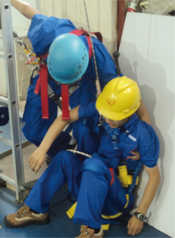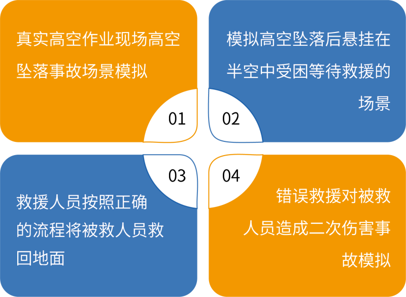 本项目在虚拟环境中模拟高空作业人员从高处坠落后发生安全带吊挂事故,悬停在半空中等待救援的场景。施救 人员携带高空救援用品采用正确的施救方法将受困人员救回地面,训练学员高空救援的技能。